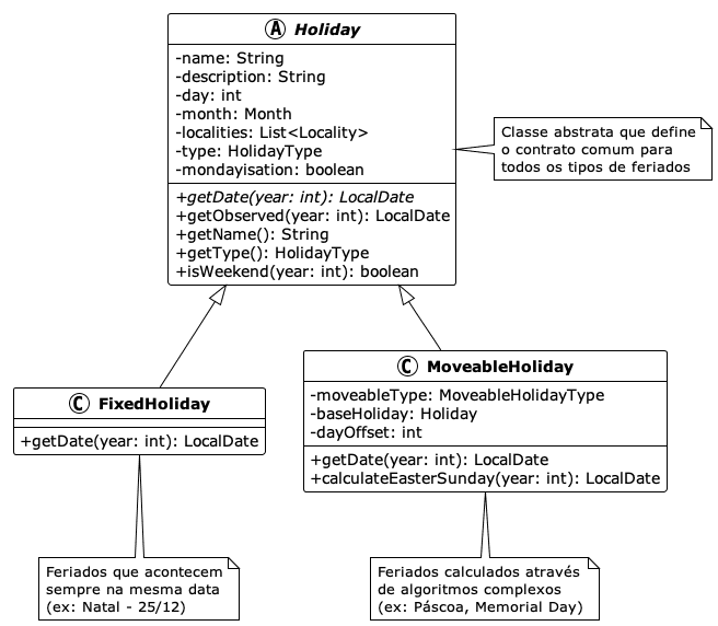 subclasses FixedHoliday e MoveableHoliday especializam a implementação do